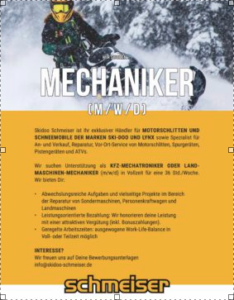 Skidoo Schmeiser ist Ihr exklusiver Händler für Motorschlitten und Schneemobile der Marken Ski-Doo und LYNX sowie Spezialist für An- und Verkauf, Reparatur, Vor-Ort-Service von Motorschlitten, Spurgeräten, Pistengeräten und ATVs. Besuchen Sie uns in unserem KFZ-Meisterbetrieb in Oberstaufen (Oberallgäu) oder kontaktieren Sie uns über das Formular.